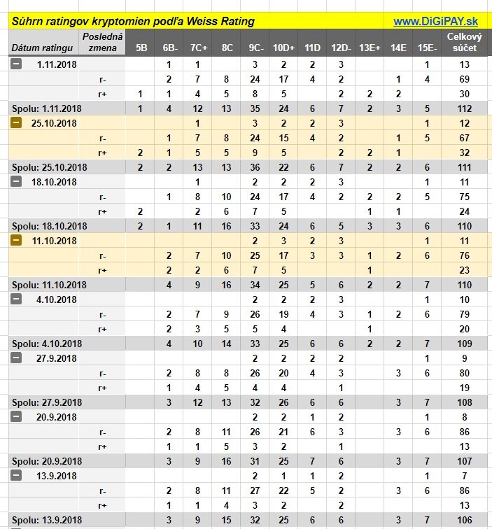 Pozitívne posledné zmeny ratingov k 25.10.2018 sú v tabuľke vyznačené zeleným podfarbením, negatívne zmeny ružovým :