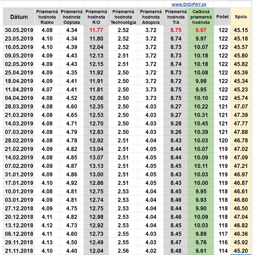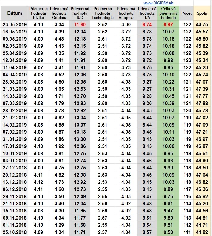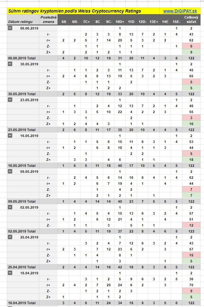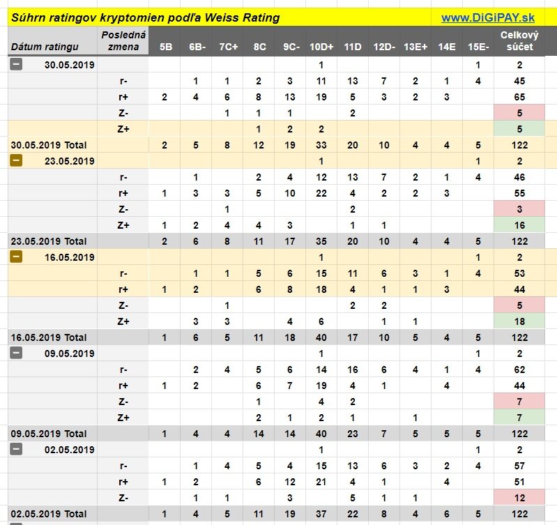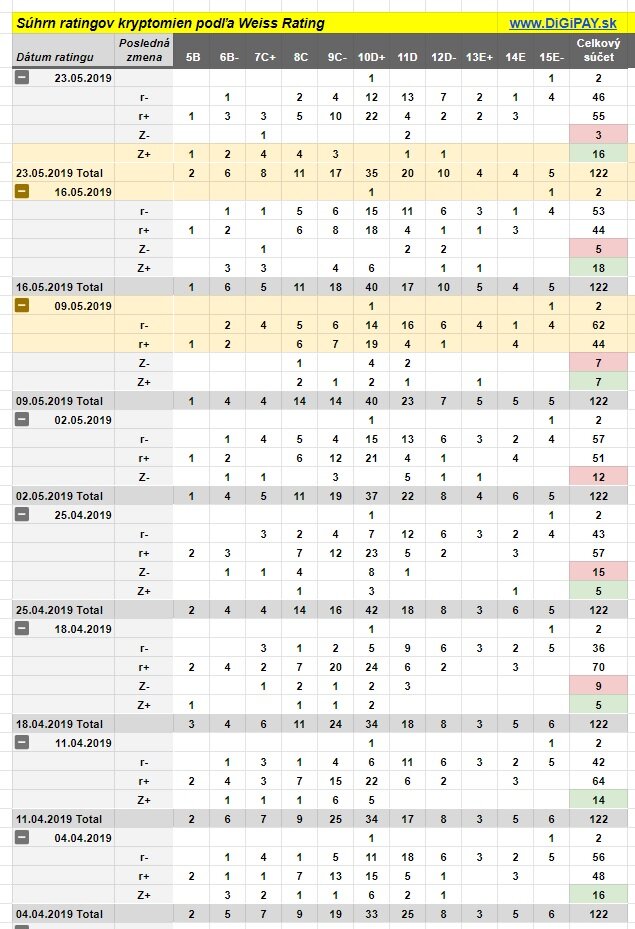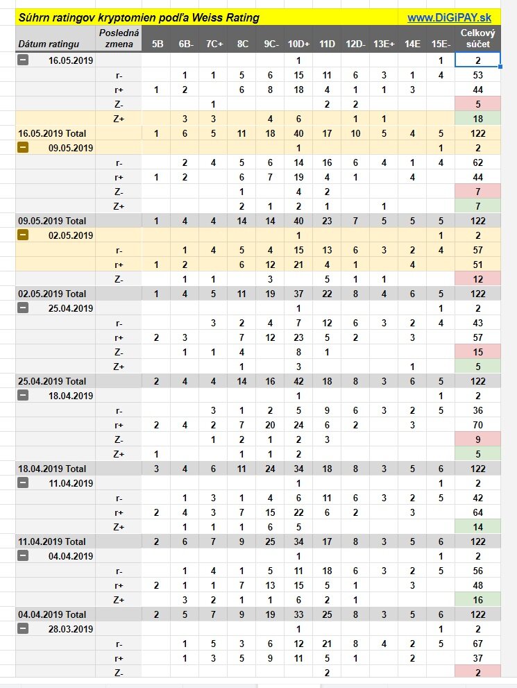 Prvý májový rating priniesol negatívnu zmenu ratingového pásma 12 kryptomenám. K pozitívnej zmene ratingu tentokrát nedošlo.
