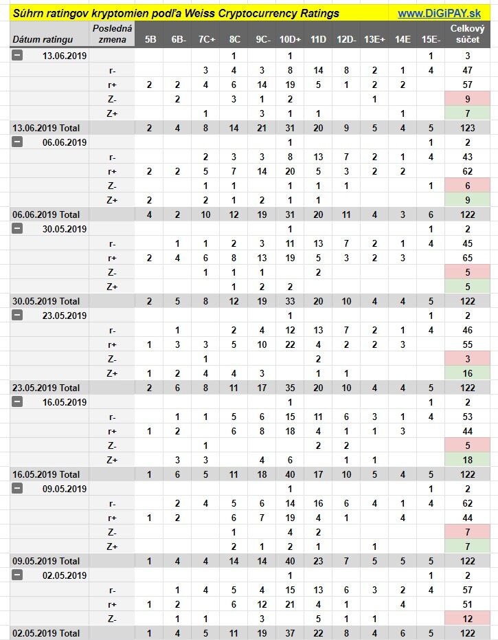 Doteraz najlepšie ratingové pásmo “B” opustila kryptomena Binance Coin, ktorá sa zhoršením ratingu presunula do pásma “B-“. V ratingovom pásme “B” tak zostáva už iba osamotený EOS, nakoľko XRP od Ripple Labs z tohoto pásma odišlo už pred dvomi týždňami.